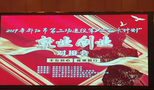 20191120日下午,由邵陽市退役軍人事務(wù)局主辦、邵陽市各縣市區(qū)退役軍人事務(wù)局協(xié)辦、湖南廣電芒果V基金等單位承辦的2019邵陽市第二場退役軍人“百千計(jì)劃”就業(yè)創(chuàng)業(yè)對接會在武岡市皇冠世紀(jì)酒店隆重舉行。